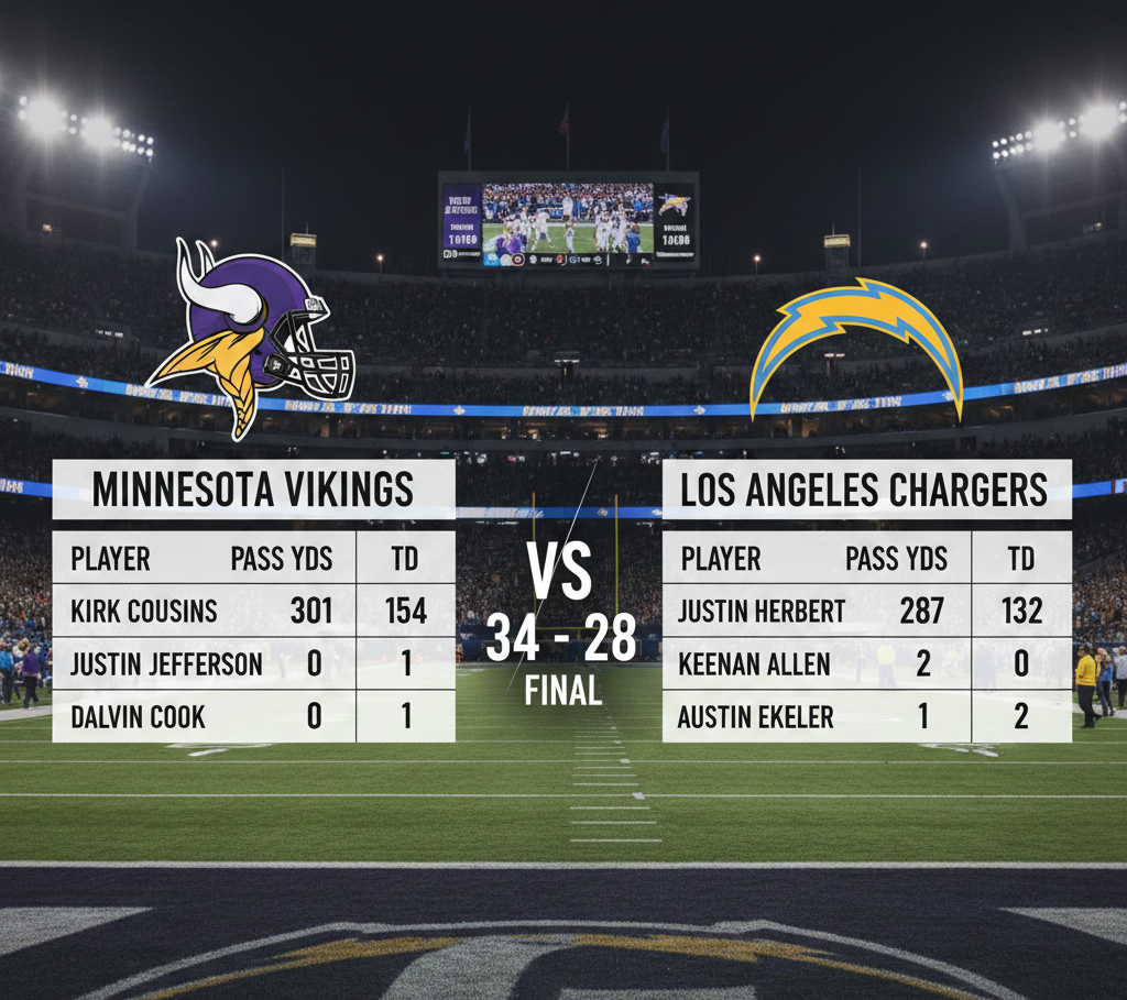 The Minnesota Vikings vs Chargers match player stats tell a compelling story of efficiency versus explosiveness. While passing yard totals favored Los Angeles slightly, situational football—third downs, red-zone execution, and defensive takeaways—tilted the contest toward Minnesota.